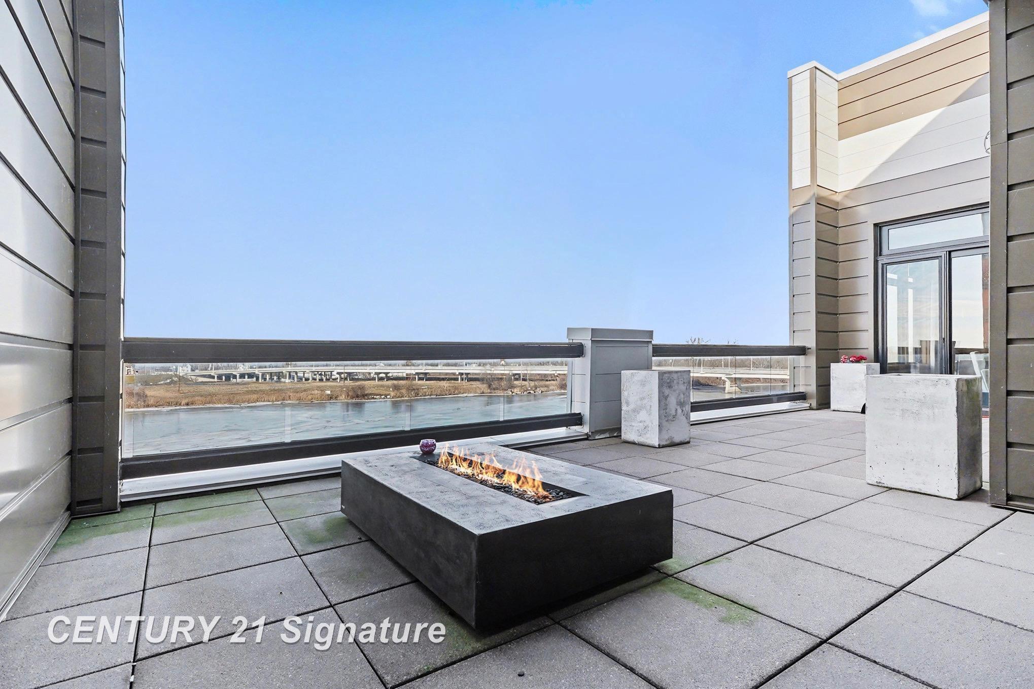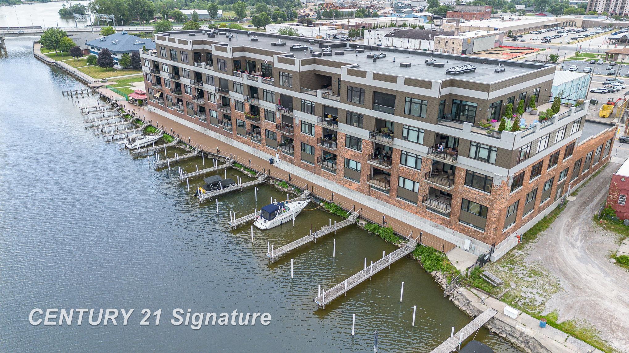 Experience elevated waterfront living in this exceptional 3-bedroom, 4-bath penthouse condo, where floor-to-ceiling windows showcase breathtaking views of the Saginaw River, Liberty Bridge, and the steady charm of passing freighters. Multiple access points lead to an expansive balcony that spans the residence, creating an effortless connection between indoor comfort and outdoor enjoyment. Inside, MGM-inspired design elements blend sophistication with warmth. Stunning hardwood floors flow throughout the open layout, complementing the sleek finishes and dramatic architectural detail. The chef’s kitchen impresses with double ovens, an oversized built-in refrigerator concealed behind a striking accent wall, a massive walk-in pantry, and a conveniently located wet bar ideal for entertaining. Each bedroom has its own private en-suite bath, ensuring comfort for family and guests. The primary suite stands out with its generous scale and an expansive walk-in closet offering exceptional storage and a beautifully appointed spa-like bath. The third bedroom provides flexible use as an office and is equipped with a Murphy bed, making it an easy dual-purpose space. A stylish powder room adds additional convenience for guests. This penthouse includes two dedicated parking spaces, private storage, and its own dedicated boat slip, offering exceptional access to the water and a rare amenity for condo living. Residents also enjoy beautifully maintained shared spaces including an elegant lobby, a large event space with an attached catering kitchen, a club room, and a serene library. Luxurious, functional, and perfectly positioned along the river, this penthouse delivers the ultimate in upscale condo living.